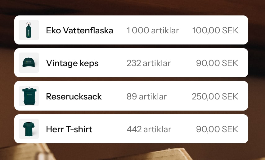 Dina team får en och samma plats där de kan beställa kläder, dryckesprodukter, kontorsartiklar, teknik och specialprodukter – utan att jaga godkännanden eller leta leverantörer. Du bestämmer sortimentet; vi kuraterar, profilerar och underhåller det.