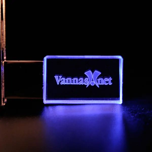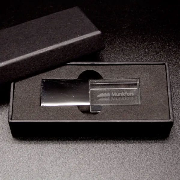 USB-minne med kronglas och 2D- eller 3D-gravyr. Logotypen lyser med LED-ljus vid användning.