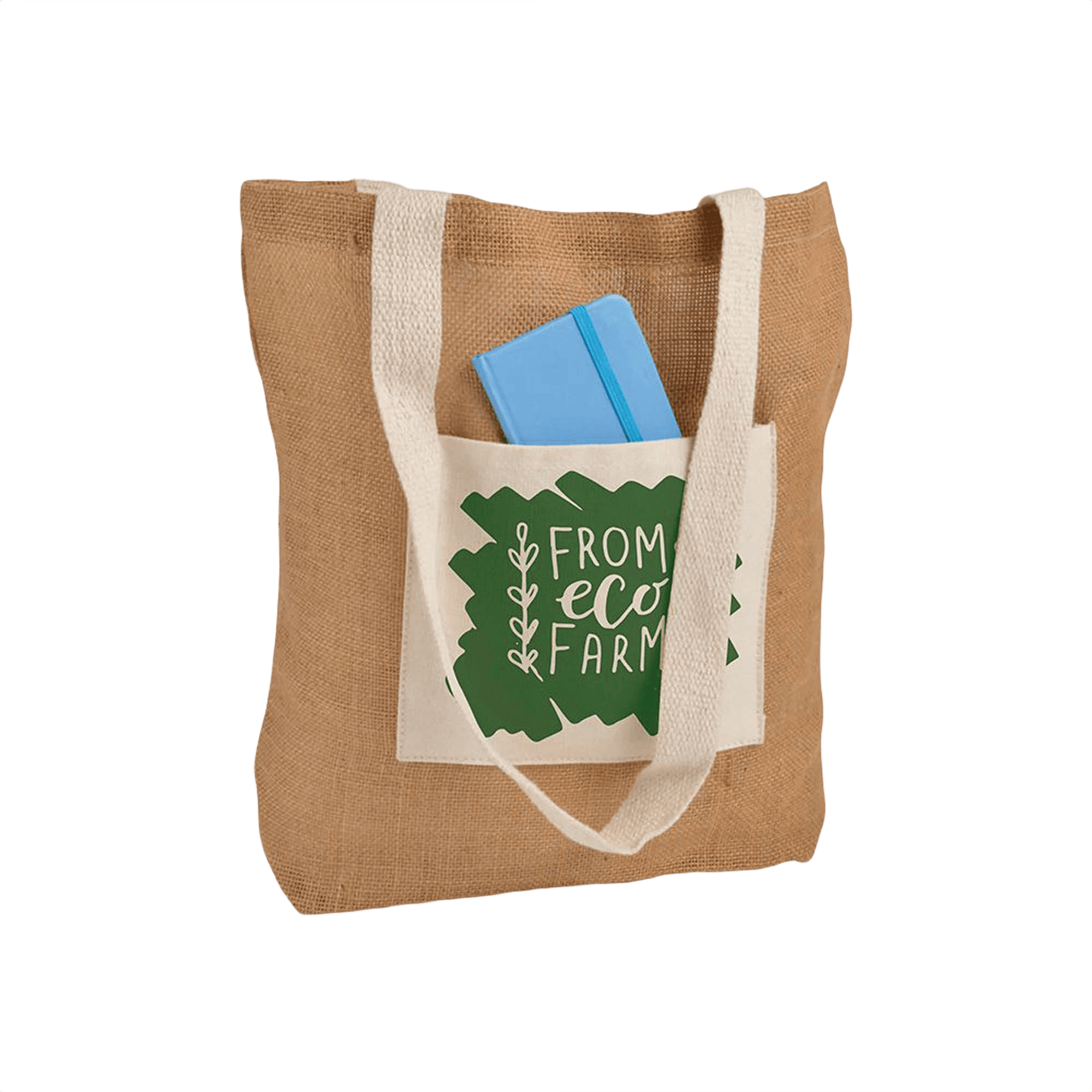 Denna jute-shoppingpåse kombinerar naturliga material med praktiska funktioner som en bottenbälg och handtag. En framficka i naturbomull adderar extra nytta. Perfekt för anpassad branding, denna påse förmedlar lätt ditt miljömedvetna budskap.